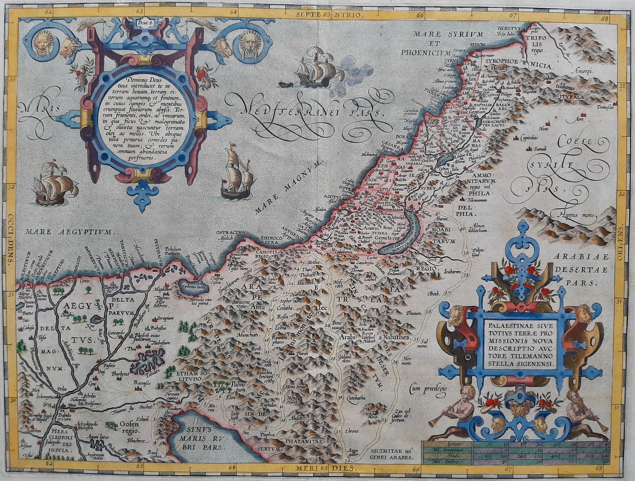Palestinae sive totius terrae promissionis nova descriptio auctore Tilemanno Stella Sigenensi.Oude, antieke landkaart van het Heilige Land. Titel in grote rolwerk-cartouche rechts onder. De schaalstokken onder deze cartouche. Links boven een tweede rolwerk-cartouche met beschrijving. In de zee diverse schepen. Rugzijde Latijnse tekst.