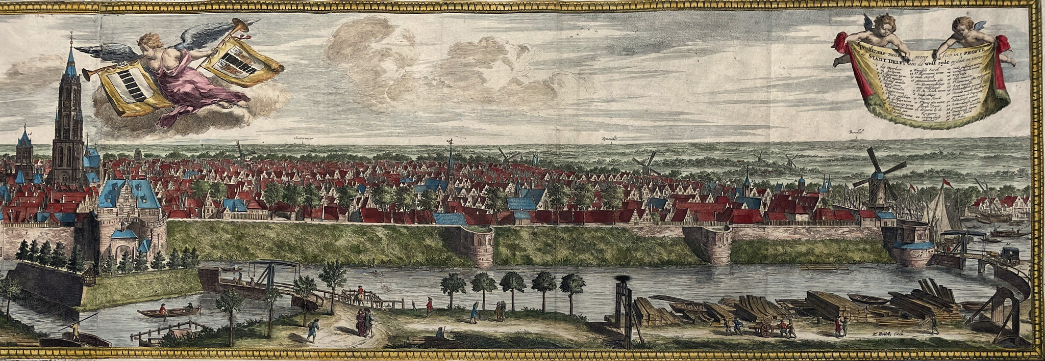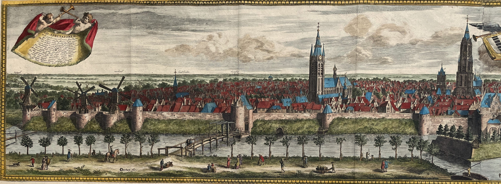 Oude, antieke prent van Delft. Titel met legenda rechtsboven op draperie gehouden door twee putti; linksboven een toelichting gericht aan de 'toeschouwers', AD SPECTATOREM, door Nicolaas Heins, eveneens op draperie, gehouden door twee putti, elk blazend op een hoorn; midden boven een engel met twee hoorns met daaraan bevestigd de wapens van de stad.