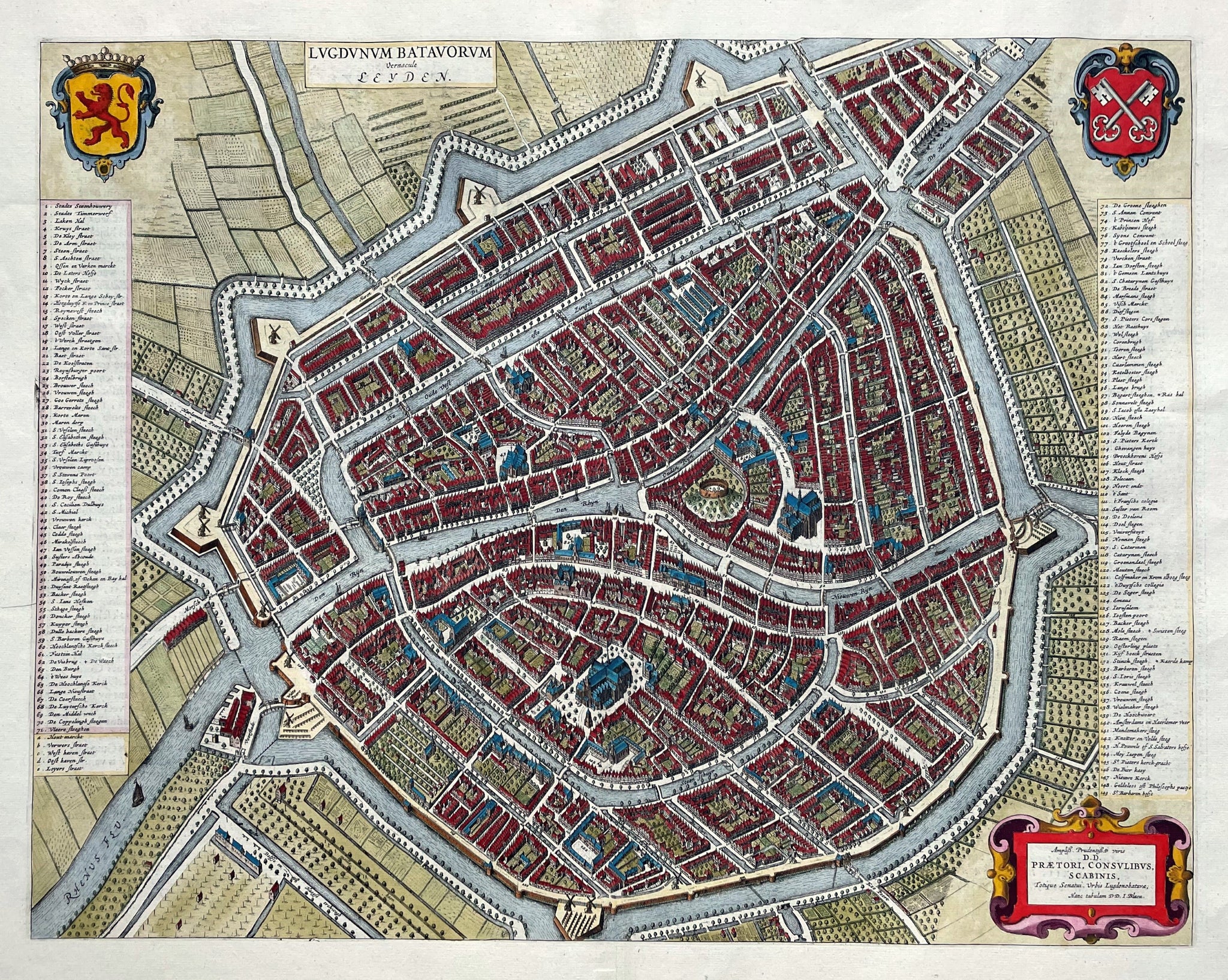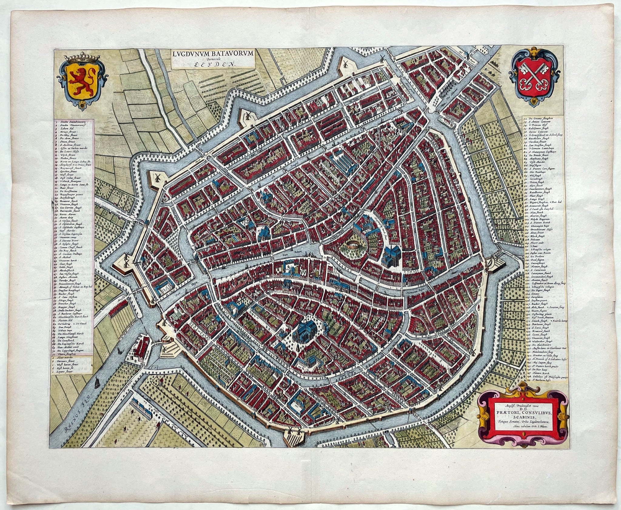 Stadsplattegrond met opstanden van gebouwen en huizen. Titel bovenaan, links uit het midden. In de bovenhoeken links het wapen van Holland en rechts het stadswapen. Aan de linker- en de rechterzijde een uitvoerige legenda met 149 aanwijzingen. Rechts onder opdracht (stadsbestuur) en uitgeversimpressum Joan Blaeu. Rugzijde Nederlandse tekst.
