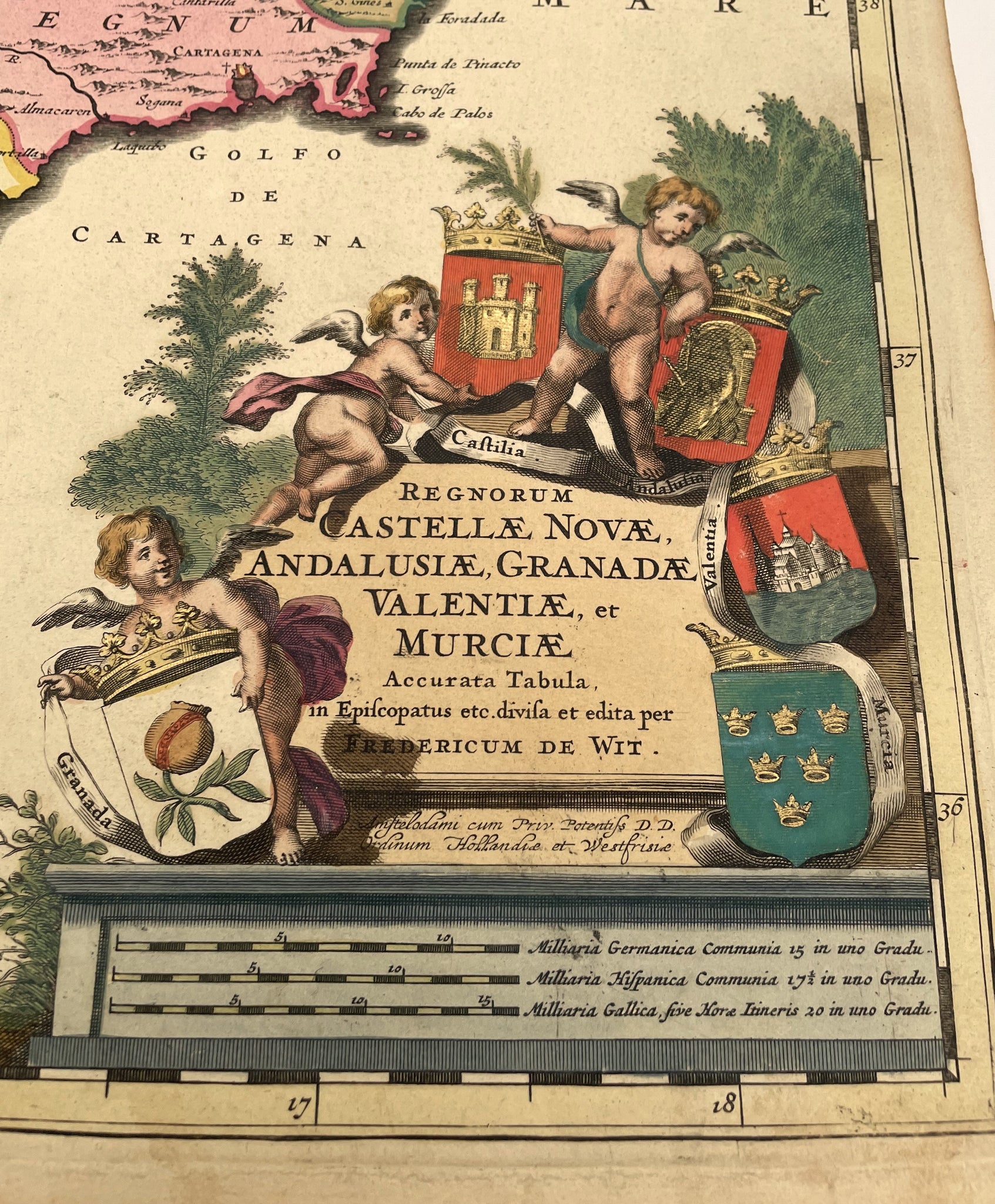 Oude, antieke landkaart van Castilië, Andalusia, Granada, Valencia en Murcia. Titelcartouche met schaalstokken rechts onder. Rugzijde blank.